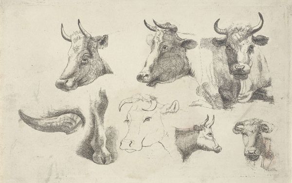 Curator: Here we have Hendrik Voogd’s "Four Studies of Reclining Cows," created sometime between 1778 and 1839. The medium is pencil on paper. It is now part of the Rijksmuseum collection. Editor: It’s… strangely calming. They seem so content, almost stoic. It makes me think about the pastoral tradition and how idealized the countryside was becoming. Curator: You’ve hit on something key. Voogd, though Dutch, spent a significant portion of his career in Italy, absorbing and reinterpreting classical artistic ideals. These studies exemplify a kind of idealized rural life—simplified, peaceful, harmonious. The cow, in that sense, takes on a symbolic weight. It becomes more than just a farm animal. Editor: More than a milk producer. So, were cows an established symbol of anything specific at this time, or was Voogd crafting something new? I am so curious if it means something more. Curator: Cows were linked with fertility and abundance, especially in Dutch Golden Age painting. In a broader sense, agricultural prosperity often symbolized national strength. Here, the academic realism blends into pastoral imagery. Voogd presents the Dutch perception of cattle as an image of pastoral and national wellbeing. Editor: The poses of the cows too feel considered. Not particularly active or energetic. A symbol for quiet comfort. There’s a kind of gentleness about them, despite their size and horns. Even the artistic method -- simple pencil strokes on paper. Curator: A point worth emphasizing, and well captured! The technique reinforces that sense of tranquility. Think about how often the Dutch landscape was celebrated through images like this during periods of both great wealth and political change. It acted as a form of stability. It shows a continued symbolic anchor even during a time of significant historical and societal shifts. Editor: Looking at the symbolism through history—cows as the ever-present anchor through shifting values, societal restructuring… Thank you, it has added so many interpretive layers. Curator: Precisely! It makes you ponder how enduring images subtly reinforce certain cultural narratives over time. A gentle yet insistent kind of message embedded in art.
