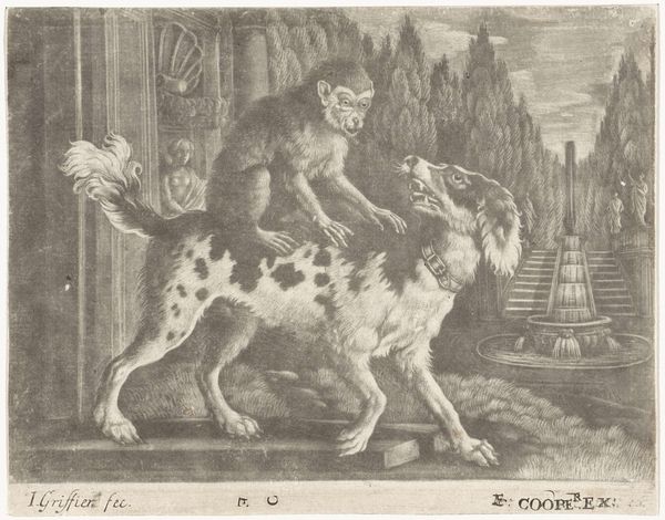 Curator: Welcome to this intriguing 17th-century print by Jan (I) Griffier, titled "Aap en kat bij een haard," or "Monkey and Cat by a Hearth," executed between 1680 and 1694. Editor: Immediately, the energy is chaotic! Look at the frenzied grappling of the monkey and cat before the blazing fire. The etching itself is alive with tension and a sense of imminent disarray. Curator: Indeed. Let’s observe the technical qualities more closely. The intricate lines, achieved through etching, define form and texture with remarkable precision. Notice the contrast between the dark shadows and the stark white of the paper; this emphasizes the dynamism of the scene, pushing the figures forward. Editor: But the subject matter screams social commentary, doesn’t it? It feels charged. Consider the historical context; animal allegories were frequently deployed as satirical mirrors to reflect and critique societal behaviors and norms. Is this chaos an intended reflection on domestic discord, or perhaps colonial tensions, distilled down to these two struggling creatures? Curator: The composition focuses on the interplay of the figures, drawing attention to their postures. The monkey's pose atop the cat creates a precarious structure. Meanwhile the artist meticulously renders the texture of the animals’ fur using very fine lines. Editor: Absolutely, and look how these species are historically represented. Cats as symbols of domesticity versus the monkey—often associated with exotic 'otherness'. Their struggle plays out directly in front of the hearth, typically the heart of a home, rendering the conflict deeply symbolic. The act of keeping the home fires burning seems thwarted here, burdened by some implied internal strife. Curator: Do you believe the narrative is so literal? Couldn't this also be interpreted through form alone? We can explore balance, the tonal gradations, the play of light across texture. Editor: Well, let’s think about it; by injecting meaning we unlock its continued relevance. This isn’t merely a depiction of a monkey and a cat fighting, but, rather, an artwork prompting us to examine power dynamics and societal relationships embedded even within our most intimate spaces. Curator: It does reveal layers that deepen the more one considers them, wouldn't you say? Editor: Indeed, making the artwork a space for us to interrogate our assumptions and histories, ultimately questioning what—or who—we exclude.