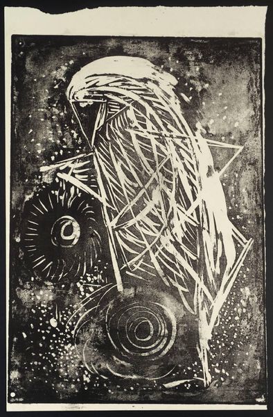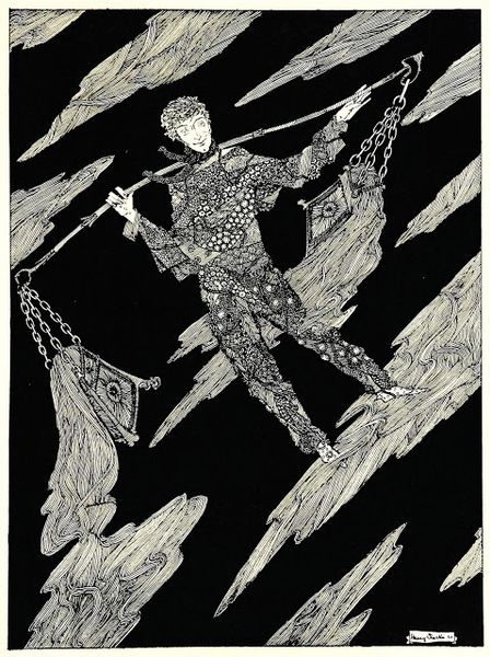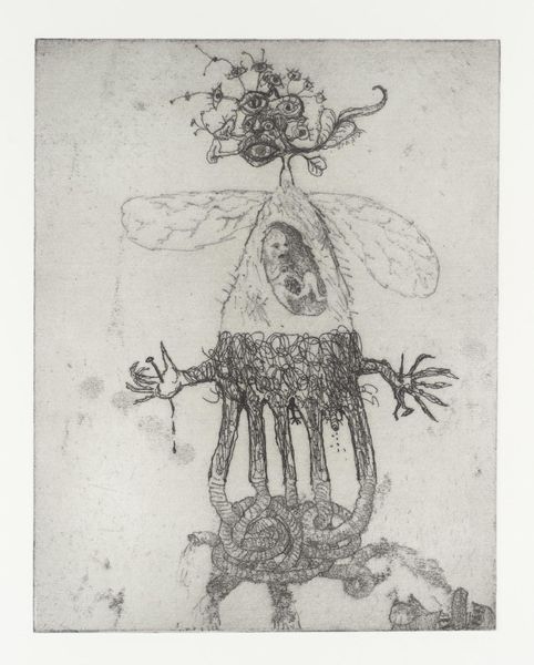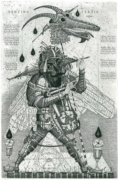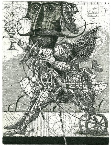 Editor: Here we have Oleh Denysenko's "Flying Pilgrim," created in 1997 using pen and ink. The meticulous linework gives the figure such an elaborate, almost mechanical presence. What strikes me most is how this 'pilgrim' seems burdened, not freed, by all this elaborate gear. What stands out to you? Curator: It's the density of that "gear," as you call it, that is fascinating. Look at how the artist has assembled this figure using found objects or repurposed technology of his time. The bicycle wheels at the base, the clockwork mechanisms embedded within the armor—they speak to a specific moment of material culture. Editor: So, it's less about a spiritual journey and more about a physical, perhaps even industrial, one? Curator: Precisely. This figure is defined by its construction, the labor and materials that went into its creation. The pen and ink themselves become part of that narrative; each stroke a deliberate act of making and accumulation. What do you make of the inscription "In Arte Libertas?" Editor: “In Art, Freedom.” Is the artist perhaps questioning whether true freedom is possible even within the act of creation, if one is limited to the materials and resources available? Curator: Yes, or even more pointedly, highlighting the economic and societal factors that always constrain even the most seemingly "free" artistic expression. The means of production, the available materials—these always dictate the possibilities, don't they? Editor: It's a powerful statement, looking at it that way. I initially saw a fantastical being, but now I see the very real limitations inherent in artistic creation and, maybe, life itself. Curator: Indeed. By foregrounding the materials and methods, Denysenko reveals the hidden structures that shape our world.