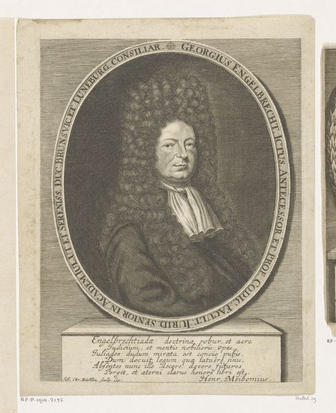 Curator: Welcome! This is a print depicting "Portret van Dietrich Conerding," made by Christian Romstet sometime between 1665 and 1721, putting it squarely in the Baroque era. The medium is engraving, giving it that incredibly detailed, graphic quality. Editor: It strikes me as remarkably stern. The intricate curls of his wig and the detailed inscription surrounding his portrait frame him in this bubble of officialdom. How do we grapple with understanding his position in society? Curator: Exactly! Looking at the means of its production, engraving like this was a labor-intensive process, signifying wealth and status. The artist would have had to meticulously carve the image into a metal plate, a task often reliant on workshops and apprentices. How did the labor conditions influence the work's aesthetic? Editor: Right, the material context is fascinating. We need to consider the role Conerding himself played as a philosopher, physician, and counselor. The print immortalizes his intellectual contributions, but the inscription and coat of arms, can you describe how that reinforces a specific kind of identity, a powerful elite one? Curator: Most definitely. This was a method to immortalize Conerding, and doing it in an engraving only added to it. And even from a craft perspective, the precision required suggests the value placed on meticulous skill during this period. But were there constraints involved in this type of portraiture production? Editor: Of course. Think of the gendered aspect; most powerful men were displayed prominently at the time but let's ask ourselves if the production reinforces or challenges the rigid social roles. While the image certainly elevates Conerding's status, doesn’t it reinforce an image of him that caters to specific elite tastes of the era, a male centered world view if you will? Curator: Certainly, prints circulated widely and functioned as tools for establishing one's importance across broader networks, even shaping our own perception. Editor: It pushes us to interrogate our assumptions. By integrating this portrait in modern conversation, we allow viewers a means to analyze the role this one plays in a society that struggles with access and equity. Curator: Examining that craft production sheds light on this historical period as well as reveals power dynamics at play back then. Editor: Yes! Hopefully encouraging further discourse and thinking about social identity from the seventeenth century till today.