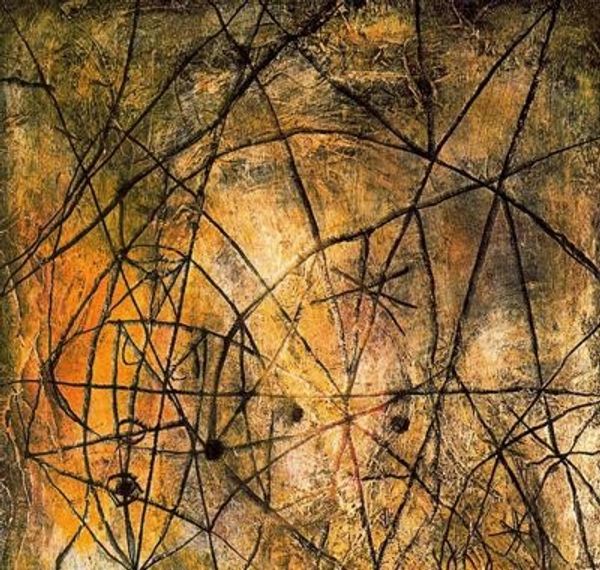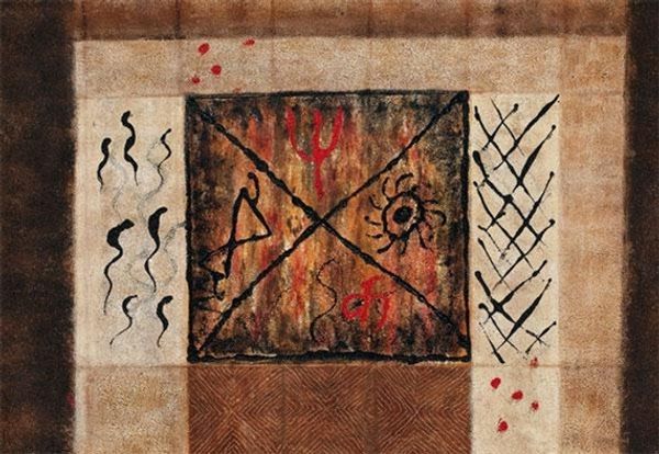 Editor: This is Modest Cuixart's "Ras de Tramort," created in 1993, using mixed media. It gives me a primal feeling, like looking at cave paintings, especially with those earth tones and abstract shapes. How do you interpret this work? Curator: That sense of primal imagery is keen, excellent observation! It speaks to something deeply ingrained in our collective visual memory. Consider the title – "Ras de Tramort" - perhaps hinting at the "stroke of death" or "end of life". The forms, almost totemic, suggest figures emerging from or dissolving back into the earth itself. Do you notice the dominance of ochre and burnt umber, colours intimately tied to the earth and the history of image-making? Editor: Yes, I see that. It's like the artist is using the colours to connect with something ancient, a shared past. That red circle—is it meant to be a sun, or something else entirely? Curator: It certainly draws the eye, doesn't it? It could represent the sun, a symbol of life, or, given the possible interpretation of the title, perhaps the setting sun, representing the close of a cycle. And what about the angular black lines? How do those resonate with you? Editor: They seem almost like fragments, broken pieces. Maybe representing a breakdown of form, or perhaps, an attempt to reconstruct something lost? Curator: Precisely. Cuixart’s layering of these fragmented forms and earthy colours invites us to contemplate the cyclical nature of existence and our own place within it, doesn’t it? Visual signs trigger associations. What we see often echoes what we already carry within us. Editor: It’s fascinating how something abstract can feel so grounded and evocative. I hadn't considered the title in relation to the imagery before; that connection really deepens my understanding. Curator: Indeed. Artworks such as these invite us to look beyond the surface, triggering reflections, sparking memories, building knowledge. It changes how we look and how we see.