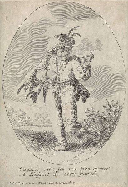 Curator: Here we have a print called "Dansende boer, obsceen gebaar makend"—Dancing Peasant, Making an Obscene Gesture—which scholars date somewhere between 1622 and 1668, attributed to Nicolaes van Lijnhoven. It's an engraving, a very baroque, figural genre painting of a, shall we say, spirited gentleman. Editor: Okay, spirited is… polite. My first thought? He looks like he’s had a bit too much celebratory beer, teetering on the edge of… decorum. The smirk is classic, isn't it? That sideways glance... total mischief. Curator: Indeed. These genre scenes, especially caricatures, give us a glimpse into the socio-political landscape of the time. The “obscene gesture” is quite loaded; these acts of defiance against societal norms, even simulated ones in art, were ways to subtly critique authority. He might represent the frustrations of the working class. Editor: Or maybe just Bob being Bob after market day! I mean, look at the detail in that floppy hat and the way he’s hiked up his britches. He's got a swagger! Though I can't help but wonder if the engraving is slightly mocking? There is an oval framing the action in what seems to be a casual scene. Curator: I read this action as critique of a performative masculinity that relies on vulgarity and overt displays of power. The gesture itself and implied proposition is interesting considering gender and class dynamics. What would the man lose if this gesture failed? It’s not only a personal risk, it may have an implicit impact on all of his peers, or "class" fellows. Editor: That’s a thought. And I'm left with that bit of text at the bottom there which loosely translated means "... she prefers my bird." So vulgarity and gender trouble? Right. Curator: The inclusion of text under a design can invite varying reactions. Its addition invites discussion surrounding what is included, as well as what is excluded from these dialogues of gender, class, and social power. Editor: True. Overall, the print, in all its rude charm, speaks volumes about freedom, defiance, maybe even joy, though perhaps within constraints we easily forget existed. A funny, and deeply fascinating piece, all around. Curator: It offers a small, but dense focal point to study history as experienced from very different points on the socio-political landscape of that time.