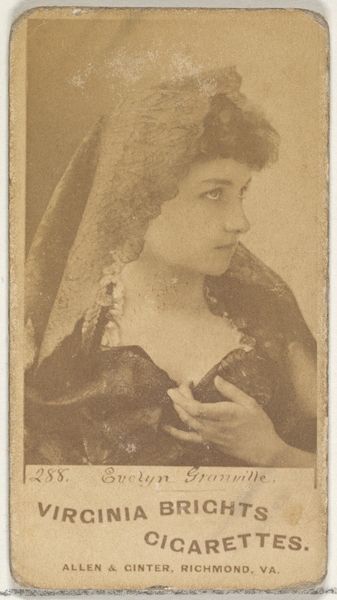 Curator: Lady Brooke looks positively Victorian in this… sepia dream. Almost haunting, like a memory struggling to surface. Editor: It's one of the “Actors and Actresses” series (N145-3), issued by W. Duke, Sons & Co. to promote Cross Cut Cigarettes in the 1880s. An odd convergence, really. Consumer culture meets… well, a vague notion of celebrity, all mediated through nicotine. Curator: It’s smaller than I imagined; a memento. I see her—the actress—sitting for the portrait, a bit weary, perhaps. She exudes a delicate beauty but there’s a faint shadow in her downturned glance. Maybe she was worried whether the lighting flatters or whether folks would buy enough cigarettes and equate that success with her. Editor: Precisely, but consider the mechanics, right? It would’ve involved lithography, the industrial production of images meant for mass consumption, slipped into packs of cigarettes. Forget individual genius; it's about the network, the materials—the paper, ink, printing press. All speaking to the rapid transformations of labour and leisure at that time. Curator: Of course! She’s just a pawn. It's strange thinking that these tiny portraits shaped public imagination or could generate cigarette sales in one go. What does she whisper, I wonder, of fleeting fame or maybe that her look would be timeless despite being printed for profit on inexpensive cards? Editor: Fleeting is spot on! We get a glimpse into how even cultural cachet could be commodified, reduced to collectible ephemera. Think about the cultural status embedded in each card, turning Lady Brooke into an element in the complex dance of industrial capitalism, consumer desire, and promotional culture. Curator: It’s poignant—to find beauty even in something born from industry. Still, I can't help but project stories onto her. Her secret smile… and that pearl earring. Maybe art thrives even as a means to some end… Editor: Ultimately, even though seemingly simple, these material objects present complex histories, hinting to how the circulation of images was as tied up in the expansion of consumer markets. It makes it all so much more vivid, really.