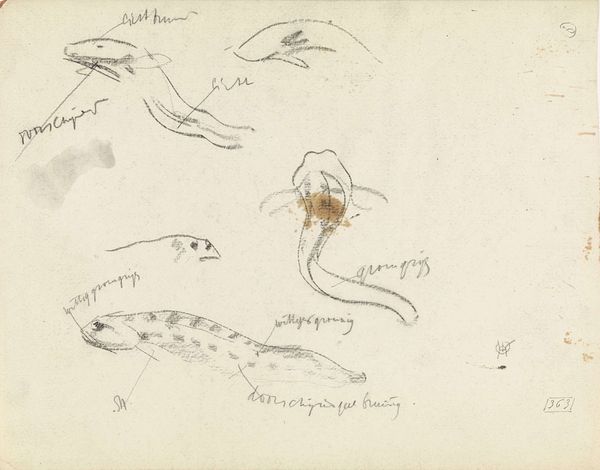 Editor: So, this is "Slakken," a pen and ink drawing from around 1916 by Reijer Stolk, housed here at the Rijksmuseum. It’s essentially a page full of snail sketches, almost like a naturalist's notebook. They're cute, but something about their blank expressions is also slightly unsettling. What strikes you when you look at this drawing? Curator: The initial impression is deceptively simple, isn't it? These aren’t just sketches of snails; they’re vessels for something deeper. Think about the snail as a symbol throughout history. In many cultures, they represent patience, determination, the slow but steady progress. What could Stolk be hinting at here? Editor: Perhaps he's commenting on the slow pace of life or change? Or maybe poking fun at something? Curator: It's tempting to read them literally. But consider the period. 1916 was a time of immense upheaval. Could these snails, in their quiet, persistent movement, represent a subtle commentary on the resilience of life amidst chaos? Or perhaps a yearning for a slower, more deliberate existence as a form of personal psychology for the artist during the tumultous environment? Editor: I never thought about them that way, I just saw some doodles. That's quite profound considering they’re just snails! The simple, almost childlike rendering adds another layer. Curator: Exactly! The simplicity enhances the universality. Stolk removes the grandeur, focusing on these humble creatures as reflections of our own persistent journeys, our own internal landscapes. Even the spiraling shell… what could that evoke? Editor: Growth, maybe? Or a journey inward? It definitely feels like there’s more here than meets the eye. Curator: Precisely. They echo with symbolic weight, inviting introspection on perseverance, memory, and continuity in a world marked by fleeting and often destructive changes. What do you think you will remember from them? Editor: To look beyond the surface, I think. And maybe to embrace the slow pace of things sometimes!