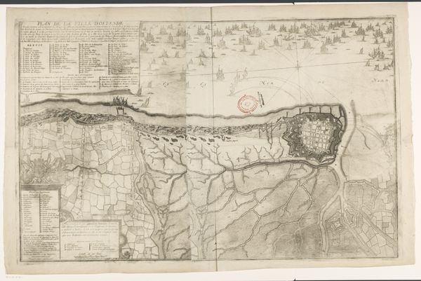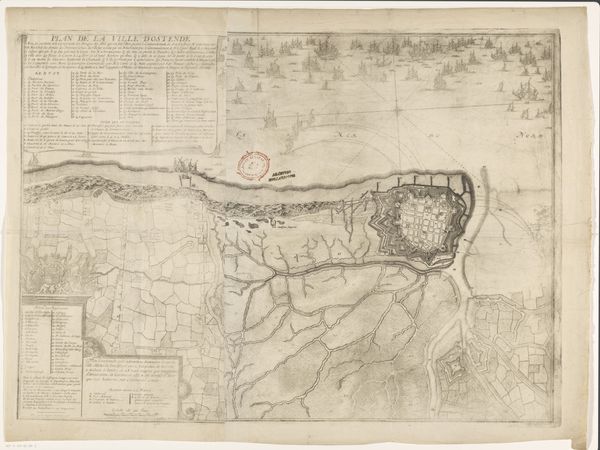 Jacobus Harrewijn created this print of the siege of Oostende in 1706, and it's now held in the Rijksmuseum. The pale sepia tones and detailed line work give this print its aesthetic appeal and suggest a sense of historical distance, inviting contemplation on themes of conflict and urban space. The print is dominated by the detailed rendering of Oostende, a city depicted with sharp geometric precision that highlights its fortifications. Harrewijn's method combines the aesthetics of cartography with the drama of historical narrative. The composition invites us to consider how space is not just geographical but also strategic and political. The meticulous attention to detail and structured organization of space serve a dual purpose, both documenting the siege and reinforcing a sense of order and control amid conflict. This map challenges us to consider how we perceive and represent space. It also encourages a dialogue about the relationship between art, science, and power.