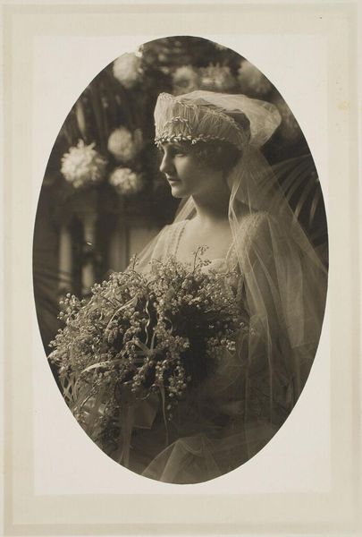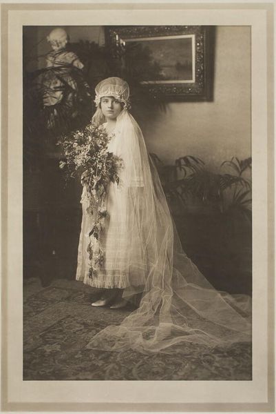 Curator: This is an untitled photograph by Martin Schweig, part of the Harvard Art Museums collection. The sepia tone and soft focus give it such a timeless feel. Editor: Yes, almost like a dream. The composition, with the seated bride surrounded by foliage, creates a very enclosed, intimate space. It feels almost voyeuristic. Curator: Schweig really plays with light and shadow, doesn't he? Notice how the veil both obscures and reveals, adding a layer of mystery to her expression. Editor: Absolutely. The veil functions as a semiotic marker of transition, visually highlighting the liminal space of the bride. The background foliage, like a wall, further emphasizes this separation. Curator: It’s interesting to think about what Schweig wanted to capture. Was it the societal expectation, the individual woman, or something else entirely? I feel such tenderness. Editor: A complex interplay of societal ritual and private emotion, indeed. I find the structural balance between the dark background and the luminous dress particularly compelling. Curator: It gives you a lot to think about, doesn’t it? It's nice to see this perspective. Editor: It certainly does, thank you for your insights.