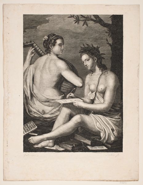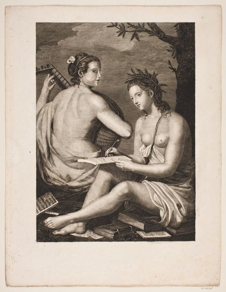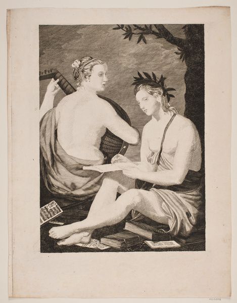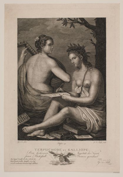 Gerhard Ludvig Lahde produced this engraving, "Terpsichore et Kalliope," sometime between the late 18th and early 19th centuries. The image depicts two of the nine muses from Greek mythology, one strumming a lyre and the other writing, set within an idealized landscape. Lahde was a printmaker working in Denmark. It's worth remembering that, at the time, the Royal Danish Academy of Fine Arts was central to artistic production. The Academy promoted Neoclassicism, which looked to ancient Greece and Rome for its models. This print reflects that classicizing taste. But it also speaks to a broader cultural interest in the arts and sciences during the Enlightenment. The muses, as patrons of these fields, embodied the era's values. Note, too, that prints like this circulated widely, helping to disseminate these values beyond the walls of institutions like the Academy. To understand this image fully, we can consult sources like the Academy's records, period publications, and biographical information on Lahde himself, all to gain a better sense of the print’s original social context.