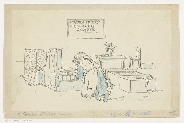 Elly Verstijnen made this ink drawing, "Zuster op een ziekenzaal," sometime in the 20th century. It's fascinating how the artist uses simple lines to create a whole scene. The drawing has this delicate, almost fragile quality because of its thin, deliberate lines. Look at how the lines define the nurse's dress, creating folds and volume with just a few strokes. You can sense the pressure of the artist’s hand as it moves across the paper. There's a certain charm in the imperfections, like where the lines wobble ever so slightly. Notice how some lines are bolder than others, giving depth and shadow to the image, especially around the children’s beds. It reminds me of Edward Gorey's quirky illustrations, where the sketchy lines add to the narrative's eerie and whimsical feel. This piece revels in artmaking as a diaristic process, making visible the beauty found in simplicity.