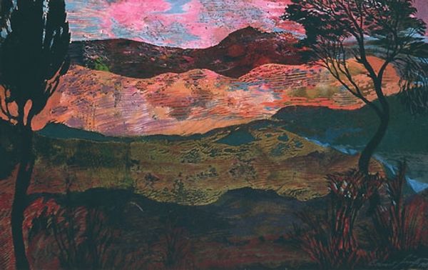 Egon Schiele made this landscape painting, "Setting Sun," with oil on canvas. He didn't employ traditional, blended brushwork here, but rather, used a dry-brush technique, allowing the weave of the canvas to remain visible. Schiele's expressive style focuses on line and colour, achieving a raw, almost jarring effect. The materiality of the painting emphasizes its constructed nature. Look closely at the segmented composition and how it divides the landscape. The way the paint has been applied also creates a tactile surface that invites closer inspection. Schiele was active during a period of immense social change in Europe, including the rise of industrialization and the shift away from agrarian life. The painting can be seen as a reflection of this change, in which landscapes were measured and divided. Schiele’s interest in the way of making a painting reminds us of the labor involved in the production of art, and how materials and processes can imbue a work with deep cultural significance.