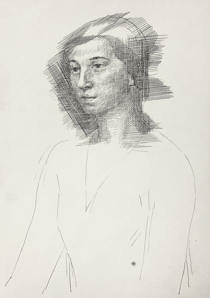 Editor: Here we have "Portret van een vrouw met hoofddoek", or "Portrait of a Woman with Headscarf," attributed to Richard Nicolaüs Roland Holst and created sometime between 1878 and 1938. It’s a pencil drawing, currently residing in the Rijksmuseum. It's really captivating, but quite understated and calm. I’m particularly interested in its composition and detail. How do you interpret this work? Curator: The composition presents an interesting study in form and line. Observe the geometrical shapes contrasted against the softer modeling of the woman's face. Note the stark contrast and the textural variations achieved with simple pencil strokes. Roland Holst compels us to examine the underlying structure—how the headscarf’s sharp angles interplay with the face's gentle curves. What do you notice about the use of light and shadow? Editor: It seems subtle; the artist avoids strong contrasts, leading to a flatter effect overall, with attention drawn to the textured fabric versus the smooth face. Does this flattening contribute to the calm atmosphere I'm sensing? Curator: Precisely. Roland Holst employs subtle tonal gradations. This piece transcends mere representation and investigates the relationships between planar surfaces and spatial recession through minimal tonal variation. Notice how line becomes both descriptive and structural; the drawing’s affect arises less from drama than quiet investigation. What compositional elements direct your gaze? Editor: The lines of the scarf direct my eye towards her face, framed and highlighted. This focus, with the simplification elsewhere, reinforces the feeling of stillness. Thank you, it's a valuable look beyond a simple portrait. Curator: Agreed, viewing artworks using formalist methods offers a distinct experience, drawing us closer to art's elemental foundations. I find new appreciation examining the interplay between intention and method in this portrait.