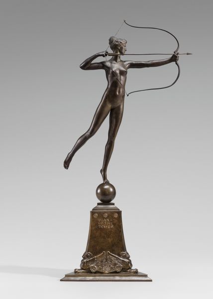 Curator: Here we have Paul Manship's "Javelin Thrower" rendered in bronze in 1921. The sculpture captures the peak moment of athletic tension. What strikes you first? Editor: A strange blend of power and vulnerability. The muscularity is obvious, yet there's a fragile quality suggested by the nude form, positioned mid-action. It evokes the ancient Greek ideal of physical perfection. Curator: Precisely. Manship was deeply influenced by classical art, streamlining and stylizing it through an Art Deco lens. Note the crisp lines, smooth surfaces, and calculated proportions. Each muscle group is meticulously defined, creating a sense of harmonic unity. Editor: That calculated quality is interesting. While appearing classical, there's a modern restraint in the details, or maybe in the man’s determined gaze. I’m also thinking about the cultural moment: The 1920s saw a resurgence of interest in physical culture, especially among men after the war. Was this athlete meant to embody an ideal of resilience and strength? Curator: Indeed. The sculpture could be read as a symbol of postwar rebuilding, projecting a vision of human potential unleashed through disciplined form. Manship creates a perfect tension between naturalism and idealization. It allows viewers to contemplate not only beauty, but human potential. Editor: I wonder about this pursuit of "ideal" beauty in a world shaped by global conflicts and changing social values. Who gets to define the ideal, and who is excluded or marginalized by it? Perhaps a more nuanced consideration of the male nude is needed, one that questions the potential exclusionary aspects of its creation. Curator: The questions you raise highlight a valid tension. Yet, examining its forms and classical ideals can lead us towards discussions regarding history, body image, and the power dynamics within our society. Editor: Ultimately, this bronze figure invites contemplation, albeit from varied points, allowing a glimpse into art historical lineages and the cultural narratives they support.