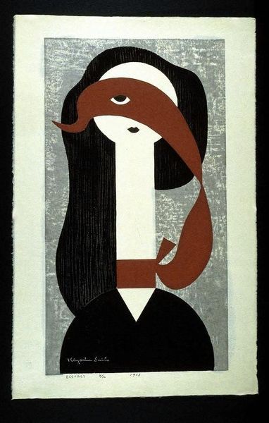 Curator: Ah, Kiyoshi Saito's "Maiko III" from 1960, a beautiful woodcut print. It has a stillness to it, don't you think? Almost like a photograph capturing a fleeting, private moment. Editor: Absolutely. There's a sense of melancholy. The cool grays and blacks mute the vibrant life often associated with geishas. The texture, it gives the whole composition a raw, earthy quality. Is that deliberate subversion of expectation something Saito was known for? Curator: Saito certainly embraced simplification. He really pulled elements from the traditional Ukiyo-e style but gave them a very modern spin. The texture, the abstraction, those were really central to his artistic fingerprint. The focus seems to be on the abstract beauty, on formal geometry almost. Editor: The starkness also highlights a critical gaze on performativity. The woman's identity is almost erased, her face obscured. What is it saying about the commodification and exoticism that maiko historically faced—particularly during periods when they were constructed to fulfill very specific fantasies for foreign audiences? Curator: That's an insightful reading! He’s abstracting her form, maybe subtly commenting on objectification. You know, he worked quite a bit with landscapes as well. It feels like his eye for reduction and quiet, profound space is just transplanted here onto a figurative subject. Editor: The simplification is so powerful; reducing a human form to shapes really concentrates the symbolic weight, right? It feels like Saito asks the viewer to question their preconceptions about femininity, identity, and culture itself. Curator: Precisely. It’s the perfect combination of graphic boldness and serene contemplation, wouldn't you say? He takes this traditional subject, reduces it to essential forms, and then breathes into it a totally modern soul. It's like a visual koan. Editor: Right, the space is activated; it stops being passive! Thank you. Considering Saito through that lens… well, the artwork opens up even further. It is about reducing visual clutter, but more importantly about clarifying perception itself. Curator: Yes, sometimes less is more, isn't it? It’s about revealing, distilling, capturing a certain spirit. Editor: Agreed.