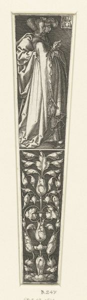 Editor: Here we have Heinrich Aldegrever's "Ornament with a Woman Holding a Carnation," an engraving likely made sometime between 1512 and 1560. The figure has such a regal presence, despite the work’s small scale. I am particularly intrigued by how he has contrasted the ornate vegetal elements with the woman at the top of the composition. What’s your interpretation of this piece? Curator: You know, it whispers of both the sacred and the profane, doesn't it? That delicate carnation – a symbol of love, but also perhaps a nod to mortality. Look at the way she holds it, almost reverently. And then, that cascade of ornamental foliage below, seemingly bursting forth with life. It's a Northern Renaissance dance between adornment and introspection. Do you feel that tension between her reserved expression, and the exuberance of the foliage? Editor: Absolutely! It is visually divided into two worlds: one human and the other… of nature? I do not understand the relation. Curator: Perhaps Aldegrever suggests that humanity and nature are two parts of a single divine pattern. Remember, these were turbulent times; the Reformation was shaking the foundations of belief. Maybe he is showing faith and ornamentation not as opposites, but essential pieces to seeing the whole, especially the "big picture." It feels, to me, like a little secret whispered across centuries! Editor: So the ornament functions more than only an “attractive accessory?” The artist expresses ideas with these details. Curator: Precisely. Every line, every curl, has intention. To see those intentions, that´s when a piece sings. Editor: This conversation gave me another way of looking at ornamental art. Curator: Mine as well. It is incredible to see the complexity of works when paying more attention to details.