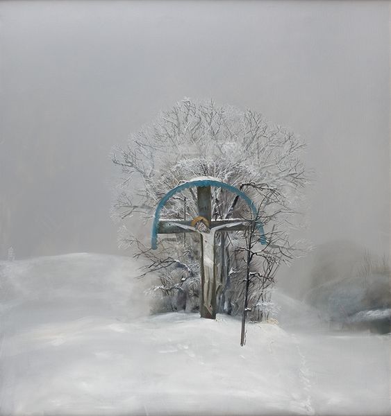 This painting, *Winter Landscape*, was made by Ivan Konstantinovich Aivazovsky, who lived in 19th-century Russia, using traditional oil paints on canvas. Aivazovsky was a master of light and atmosphere, capturing the subtle gradations of a winter's day. He would have built up layers of thin paint, called glazes, to achieve this luminosity. His mastery of the technique allowed him to depict the bare trees heavy with snow, the icy ground, and the figures trudging through the landscape. While the subject matter is romantic, portraying peasants in a serene landscape, it is important to note that this was a time of great social inequality in Russia. The painting offers a softened vision of rural life, a stark contrast to the harsh realities faced by many peasants at the time. Aivazovsky's attention to the beauty of the scene draws our eye away from the labor and social issues of the time. By understanding the materials and techniques used, as well as the social context in which it was created, we can appreciate the full meaning of the painting.