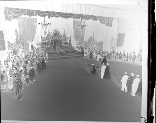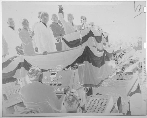 Editor: This untitled photograph by Martin Schweig depicts a formal assembly on church steps. There are military uniforms, floral arrangements and American flags. The mood is very solemn. What do you see in this image? Curator: I see a staged performance of power and remembrance, ripe with the visual language of American exceptionalism. How does the uniform function here, both as a symbol of collective identity and potential state violence? Editor: That's a powerful reading. I hadn’t considered the state violence aspect. Curator: Consider the church as a backdrop – how does it further legitimize the militaristic display? What does it mean to blend religious authority with nationalistic fervor? Editor: It’s a lot to think about, but I see how these symbols reinforce each other. Thanks for that! Curator: It’s in recognizing those connections that we can begin to understand the complexities of power and representation.