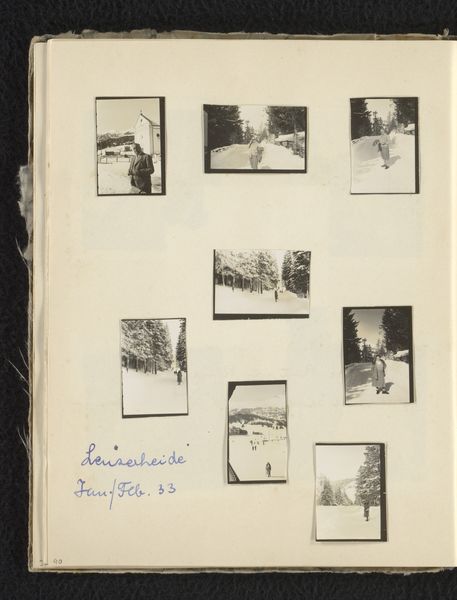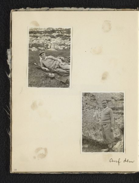 Curator: Alright, let’s discuss this fascinating page from the Wachenheimer family album, dated between 1926 and 1927. It features two portraits of Else Wachenheimer-Moos taken in Sofia. Editor: Immediately I'm drawn in by the soft light and these somewhat casual portraits. It gives me such a nostalgic feeling. The photographs, presented together like this, create a really interesting contrast. Curator: Absolutely, and considering they lived through such tumultuous times, having these quiet, everyday moments captured is particularly meaningful. On top, we see Else amongst a field and it appears a distant building is nearby. Below is a portrait of her on a balcony with, the rooftop visible. Editor: The top photograph is striking, though the figure of Else blends almost with the field! It seems like she’s contemplating something serious. The lower image with the building is almost serene, she seems more relaxed, perhaps. It suggests an inner peace even during the hard circumstances of that time. Curator: Indeed. As the post-impressionism movement developed further in 1920s, people's intimate moments and environment of everyday life started becoming the popular subject to capture in photographs. It is indeed such quiet portrait. It's street photography. Editor: I see these images almost as glimpses into a story, pieced together from scraps of everyday life. What were her days like? Her hopes, her fears? And what are those faded blemishes on the page? They add an almost ghostlike quality to the photos, making us acutely aware of time passing. Curator: That’s a beautiful reading. Considering how political unrest affected so many Jewish families throughout Europe at the time, it is incredible that family photos have lasted throughout time. It creates such strong feelings. I think it’s easy to relate to. Editor: Well said, they serve as tender and moving moments between what are now historic figures that connect our experience with theirs across a century of distance and trauma. Curator: I’d have to agree; the vulnerability caught in the photographs themselves is particularly stunning. Editor: Me too. I have chills imagining myself in her shoes, standing at that exact spot on the balcony, looking out at Sofia.