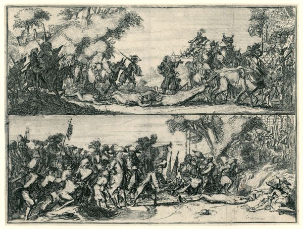 Romeyn de Hooghe etched "Twee voorstellingen van de Franse wreedheden" in 1672, capturing scenes of French atrocities. The imagery is dominated by violence and subjugation, a brutal dance of power. These scenes of violence are not unique to this time, similar imagery can be seen in antiquity when representing battles and victories. Observe the motif of the body as trophy or weapon in the top panel. This motif echoes through time, from ancient Roman battle reliefs to Renaissance depictions of martyrdom. The body becomes a landscape, a battleground for ideological struggles. Consider how such representations tap into our deepest fears and anxieties, embedding themselves in the collective psyche. The image evokes a powerful emotional response, a visceral reminder of the cyclical nature of violence and the enduring human capacity for cruelty.