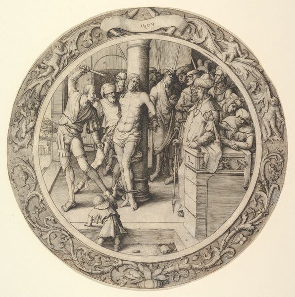 Curator: Before us is Lucas van Leyden's "Christ Crowned with Thorns, from the Circular Passion," an engraving dating back to 1509. What are your initial impressions? Editor: Stark, even brutal. The compressed composition really amplifies the violence. There’s such raw, textural detail rendered on what seems like a cold, unforgiving material. It must've been so demanding to create such intricate linework in such a rigid format. Curator: Indeed. The circular format dictates the composition, focusing our eye on the central, harrowing scene. Note the masterful use of light and shadow. See how van Leyden modulates tone through cross-hatching, creating a sophisticated atmospheric effect. The tormentors, illuminated, seem to crowd in upon Christ. Editor: And the way they lean on those staffs - emphasizing weight, pressure. It’s a picture not just of violence, but of grueling labor and exertion focused cruelly onto one individual. The act of engraving itself becomes implicated. Curator: Consider, too, the architectural details within the composition. The formal order of the Renaissance building behind the immediate scene underscores the institutional forces at play, the authorities complicit in Christ’s suffering. It adds to the spatial and dramatic depth. Editor: It also points to shifts in social power; to systems, perhaps mercantile systems, even as craft shifts into manufacture. Prints like these meant that imagery, even of suffering, could be widely disseminated. It feels both deeply devotional and strangely transactional. What do you make of that tension? Curator: I see that tension as a critical aspect of its artistic impact, underscoring that prints facilitated a much wider dissemination of faith across different levels of society, by replicating religious iconography in new portable formats. Editor: Yes. There's real emotional weight in the final impression and how the materiality of production intertwines with its sacred subject matter. Curator: A true synthesis of artistic and devotional purpose then. Editor: Indeed, a powerful and enduring testament to those intertwined spheres.