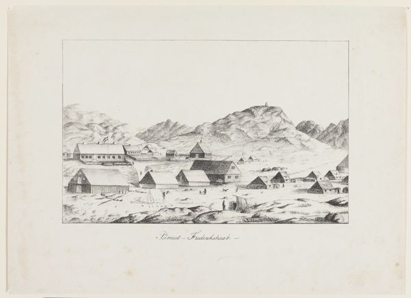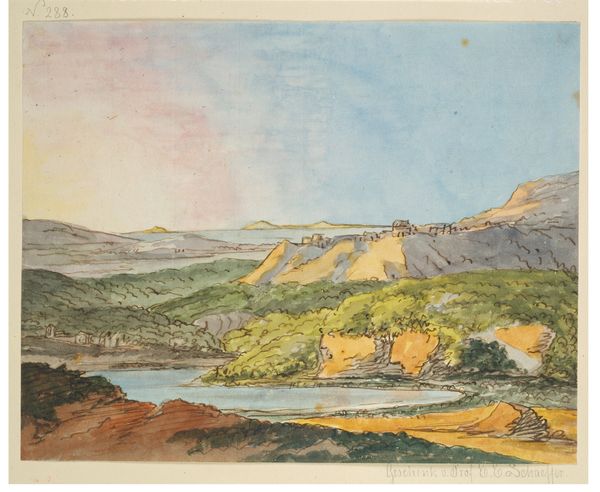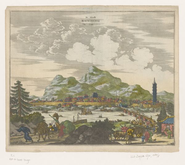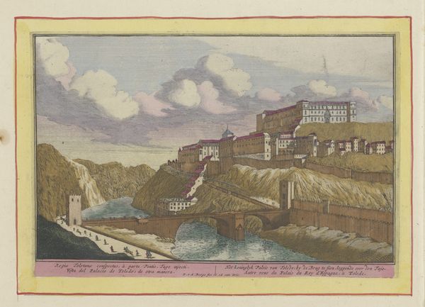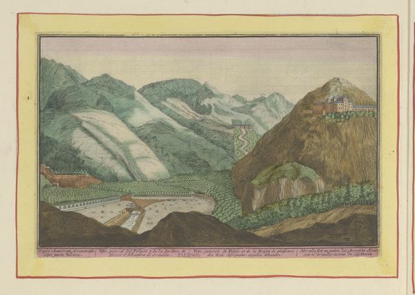 Editor: So, this watercolor is "Gezicht op Fuenterrabía," made sometime between 1694 and 1737 by Pieter van den Berge, and it’s currently held at the Rijksmuseum. I am struck by the aerial perspective and how the artist has used subtle color washes to depict the landscape. What jumps out to you about this work? Curator: Immediately, the composition compels me. Note the structured arrangement, almost a tripartite division. We see the foreground buildings anchored by a central church, then the tranquil waterway reflecting the town on the opposite bank, all set against the mountainous backdrop. How do the cool blues and greens contribute to the painting's overall structure? Editor: They create a sense of depth, almost like receding planes. But the color palette itself seems quite muted, lending a somewhat detached feeling. Curator: Precisely. The muted palette, deliberately chosen, does not overwhelm the eye, directing our attention to the lines and shapes. Notice, too, how the limited range actually intensifies the focus on each discrete architectural form, the angles of the roofs, and even the miniature figures moving within the landscape. How would you describe the lines used here? Editor: They seem precise, almost architectural, which reinforces that detached observation we discussed. There’s very little atmospheric blurring; each form is distinct. Curator: The artist, in prioritizing line and structured composition over a richer coloristic approach, creates a work where intellectual understanding of form takes precedence over immediate sensory pleasure. It's about analyzing and comprehending space, rather than simply experiencing it. Editor: That makes me see it differently. I initially saw it as a simple landscape, but now I recognize a structured representation focused on form. Curator: Exactly. It reveals the power of understanding intrinsic structure, and seeing how technique constructs that very perception.