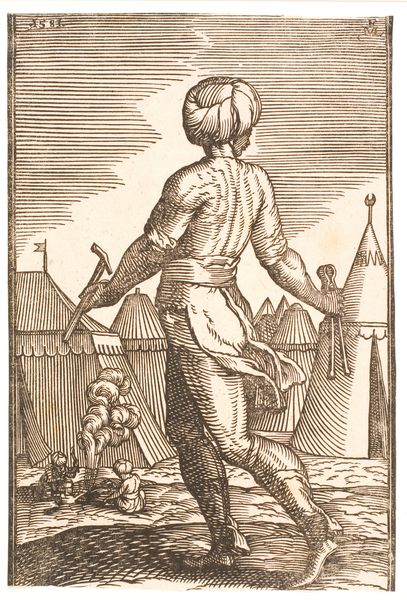 Melchior Lorck created this small black and white woodcut of a turban-wearing soldier with outstretched arms sometime in the 16th century. Lorck, a Danish artist, traveled extensively in the Ottoman Empire. Here, Lorck offers viewers a glimpse into a world then largely unknown to many Europeans. The Ottoman soldier is depicted with dignity and respect, challenging the often demonizing portrayals common at the time. His stance is confident, his attire detailed, suggesting Lorck’s attempt to render the soldier’s identity accurately. The image also subtly references the cultural exchange happening between Europe and the Ottoman Empire, hinting at a complex relationship of conflict, curiosity, and mutual influence. The architecture in the background and the soldier’s weapons further contextualize the scene, grounding it in a specific time and place. This artwork serves as both a historical document and a reflection on cultural identity and representation during a period of significant global interaction.