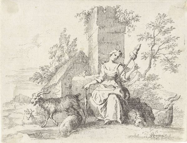 This is Gilles Demarteau’s etching, 'Young Woman with Dog, Rooster, and Hens'. Notice how the composition, with its soft lines and subtle gradations of color, creates a scene of pastoral harmony. The woman, rendered with graceful contours, is framed by a backdrop of delicate foliage, while the animals add a touch of rustic charm. The entire composition is based on balance and formal symmetry. See how the woman’s form is subtly echoed by the tree on the right, creating a visual rhythm that is reinforced by the placement of the dog and the rooster? The artwork's formal qualities destabilize traditional notions of ideal beauty. Instead, the artist draws our attention to the interplay between the artificial and the natural, suggesting a nuanced understanding of beauty. The artwork invites a continued re-evaluation of aesthetic conventions.