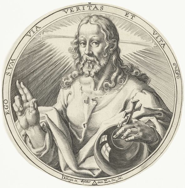 Curator: This engraving, simply titled "Christ," was created by Zacharias Dolendo, a Dutch artist active around the turn of the 17th century. Editor: I’m immediately struck by the labor involved. Look at that meticulous hatching, the sheer density of lines creating shadow and form. It feels very… tactile, despite being an image. Curator: Absolutely. The process informs the meaning. Consider the orb in Christ’s hand, topped with a cross: a clear symbol of earthly power made manifest. Dolendo is reminding us of the material world’s subjugation. Editor: And yet, above Christ’s head, the inscription “Via Veritas Vita” – The Way, The Truth, The Life – radiates like a halo, suggesting a transcendence beyond the physical. It’s a fascinating duality. Curator: The choice of printmaking itself is interesting. It allows for the widespread dissemination of this imagery, influencing how people perceived religious figures through a reproducible, accessible medium. Editor: I agree. It's a compelling interplay between spiritual aspiration and the hands that shape our beliefs.