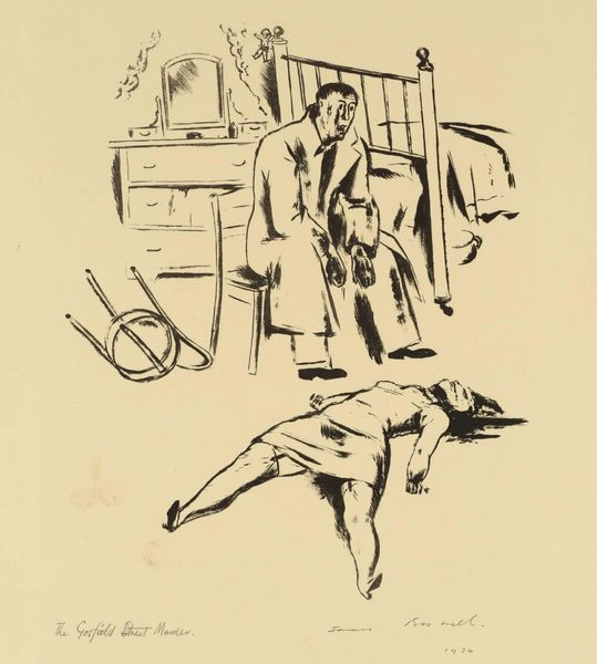 Curator: This ink drawing, "The Means Test 2," is by the Scottish artist James Boswell. It’s held here at the Tate. Editor: It's stark. Desolate. The slanting lines create such a sense of unease; it feels like the room itself is collapsing inward. Curator: Boswell was deeply affected by the social realities of his time. The title refers to the government policy during the Great Depression, where financial assistance was contingent on a rigorous assessment of one's resources. Editor: And the trombone? The overturned chair? These details speak volumes about the man's identity stripped bare by circumstance, his very means of expression rendered useless. Curator: Absolutely. Boswell uses this image to critique the dehumanizing effects of the Means Test. He highlights the immense psychological toll it took on individuals and communities. Editor: It serves as a potent reminder of art's capacity to confront uncomfortable truths, prompting us to examine the power structures that shape individual lives. Curator: Indeed, and to reflect on the social responsibilities we have to one another.