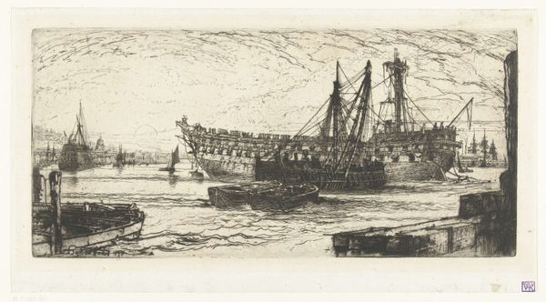 Editor: This is Reinier Nooms’s "Reparation af et sejlskib", made in 1652 using print and etching. The fine lines and details give it a somewhat stark, industrial feel, despite being a seascape. What catches your eye in this piece? Curator: Formally, it's the balance between detail and emptiness. Notice how the dense network of lines forming the ship contrasts with the open sky and water. This juxtaposition emphasizes the structure of the ship itself. Observe the intricate cross-hatching; it delineates the form and volume. How does this linearity strike you? Editor: I see what you mean, it is almost like a technical drawing in how precise everything is rendered. Do you think that was Nooms’s intent? Curator: The meticulous depiction draws attention to the construction of the ship and its architectural qualities. Focus on the interplay between the vertical masts and the horizontal lines of the hull. These opposing directional forces contribute to a sense of stability. It grounds the composition. Editor: So it’s not so much about the scene itself, but how he used line and form to create this image? Curator: Precisely. While we can acknowledge that this represents the repair of a sailing vessel, my interpretation emphasizes the purely visual elements. How line and texture come together to represent an industrial process in the seascape. Editor: I never considered looking at a landscape this way! The contrast between detail and emptiness really stands out now. Curator: By focusing on the inherent structure, we come to appreciate the deliberate artistic choices within this work, a technical rendering using fine art techniques.