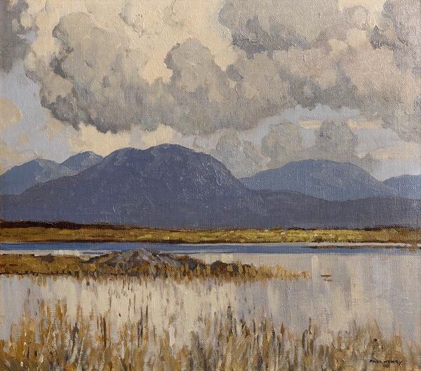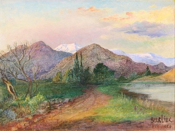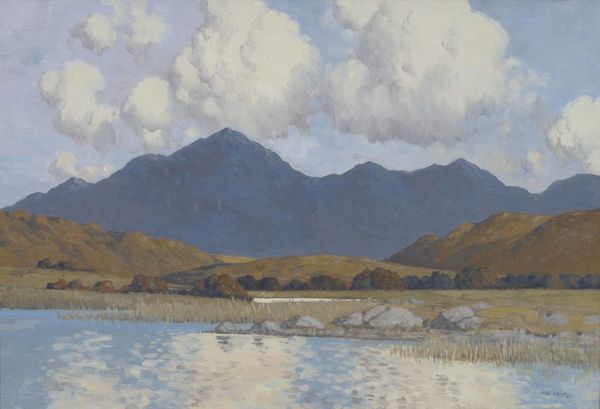 Curator: Maggie Laubser painted "Scottish Landscape with Lake and Mountains" in 1919. It presents a vista rendered with broad brushstrokes and a subdued, almost melancholy palette. What is your first impression? Editor: Raw. Visceral, almost. You can feel the impasto of the paint – it looks thickly applied, giving a weightiness to the whole scene. I want to know what brand of paint she used and whether that contributes to this particular material quality. Curator: The weight you feel might resonate beyond the paint itself. Scottish landscapes often symbolize resilience, perseverance in the face of harsh conditions. Those mountains, shrouded in soft, somber hues, can speak to a deep connection with the land and perhaps even a certain solitude. Editor: That's an interesting angle. For me, it comes back to the application. Look at how the light plays off the textured surface, how each stroke seems deliberate, functional, building both form and emotional resonance with humble material like oil. This wasn't a pristine vista to begin with; it was a working environment to which material needed to be brought and labor applied. Curator: The scene does possess an elemental quality. The lake reflecting the muted sky doubles down on that sense of spaciousness. Laubser was known for her ability to convey feeling through color and form. The scene could be a reflection of her inner state – the sky suggesting the human mind through similar layering and coloration. Editor: And that connects directly to her process. The lack of blending almost reveals the painting's making in its surface. Look at the lake; that gold and russet tone speaks of sediment and mineral deposits and local conditions that impact light on surface tension – not merely pictorial elements, but chemical conditions! Curator: So you see a raw, unflinching reflection of the land's physical processes made tangible. A psychological study mirroring geographical features? It seems that the physical weight, even the texture of the painting itself, carries multiple symbolic loads. Editor: Exactly. Knowing more about what she brought to that labor and under what material constraints offers, for me, greater insight into what, in turn, we may project on her landscapes and their power.