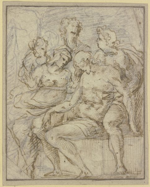 Curator: Here we have "Allegorical composition with three female figures in front of a picture on an easel, one with a mask at her feet, another accompanied by a swan." Dating from 1700-1749, this intriguing drawing comes from an anonymous artist. Editor: It feels incomplete, somehow, like a fleeting thought captured on paper. I’m immediately drawn to the figures – they have a delicate strength, draped in classical garb. The color gives warmth, but the sketchiness makes it feel urgent. Curator: Indeed. Its allegorical nature begs the question: What narrative is unfolding? The mask at the foot of one figure, coupled with the swan beside the other, hints at layered meanings related to deception, beauty and truth. Given the period, classical learning would have been immediately accessible to viewers. Editor: Exactly. Masks often represented theatricality and social artifice, prevalent concerns as political structures shifted in Europe and people actively participated in new social systems. How were the female figures intended to be read here? Are they embodying Justice or Liberty, or perhaps allegorical personifications of abstract virtues and sins? Curator: The easel in the background suggests this might even be an artist reflecting on their process. Artists throughout history would incorporate cultural markers and popular social allegories in their portraits to comment on social trends in any period. How might this unknown artist use symbols such as a swan or a theatrical mask to talk about social norms in the renaissance period? Editor: Precisely, a time where representation and image control were paramount, especially for women navigating patriarchal systems. The sketch, perhaps incomplete to modern eyes, leaves space to consider all possibilities of women, both on stage and off. This is far beyond simple visual communication. This is how art intervenes in cultural awareness! Curator: Agreed, its rough strokes tell volumes about the artist’s attempt to weave a cultural web with visual metaphors for people. A visual statement reflecting that period and it’s perception in real-time. Editor: What is ultimately amazing here is that even with an unknown artist from a distant century, we can look to history for reflections on contemporary values, concerns, and political trends by viewing this artwork. Curator: Precisely. By analyzing art, and how museums are used, can help inform socio-political climates. Editor: By digging into visual communication and its meanings, it has the capacity to challenge power relations even to this day.