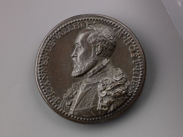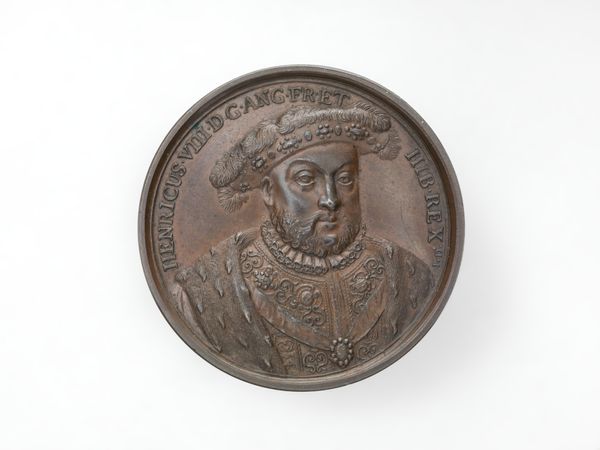 Curator: Jean Dassier crafted this bronze medal around 1731-32, part of his English Monarchs series, which now resides here at the Met. Editor: It has the feel of holding a lost memory, doesn’t it? Something discovered in an attic trunk—the solemn profile peering out from the darkened bronze. Curator: Absolutely. Dassier was Swiss, but he understood how to tap into British historical narratives. Medals like these were mass produced; casting allowed for dissemination of power and prestige beyond paintings. We can trace how such objects acted as markers of status and circulated ideas about monarchy. Editor: Status indeed. All that tiny detail! Look at the crown, the ermine, the chain of office. He must have had an amazing eye and incredible patience to work with metal in this scale. The portrait itself is... wistful. A king, but somehow a vulnerable one. Curator: Richard II’s reign was indeed tumultuous. Dassier and his workshop were incredibly strategic; using bronze—a relatively inexpensive material—allowed a wider segment of the population to own and display a piece of history, reinforcing notions of lineage and succession. These weren't just portraits; they were political objects. Editor: Political indeed! I'm always struck by how objects transform into storytelling devices. The bronze carries so much weight, but the story is richer when you think about where this piece traveled. What homes it might have sat in, conversations it ignited, the ways that a mass produced king took on lives of their own. It makes the piece come alive. Curator: Yes, tracking its movement reveals aspects about consumption habits and popular fascination. That material presence you describe – seeing that history embedded into each bronze copy – invites engagement. Editor: You’ve made me see the humble metal disc with completely different eyes! I wonder about who held it, where, and how each owner reimagined its implicit story of crown and country. Curator: Exactly—a powerful effect indeed.