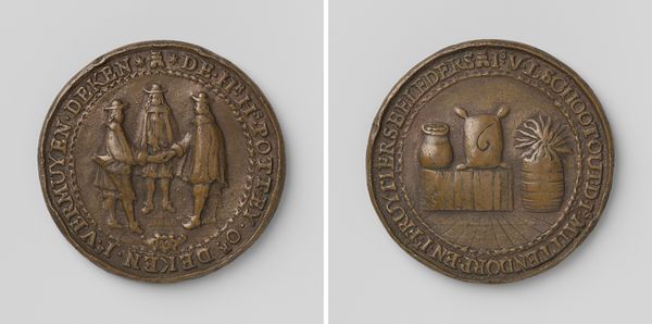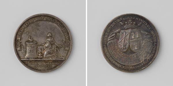 Curator: This bronze medal commemorates Rear-Admiral Lord Nelson's victory at the Battle of the Nile in 1798. Editor: It’s quite striking! The warm, patinated bronze gives it a feeling of age and importance, even before considering its subject. It looks heavy; you can practically feel the weight of it. Curator: Exactly. Medals like these weren't just decorative. They were explicitly produced to celebrate victories and heroes, solidifying their place in the national narrative. Think of them as miniature monuments. Editor: You can see that monumentality. Look at how the figure of Britannia is composed on a rocky outcrop. Her hand is above the portrait almost placing a crown of laurel upon Lord Nelson’s brow. What process was involved in making it? Curator: Lost wax bronze casting would be the likely process. The inscriptions are sharp, and the lines defining the figure of Britannia are fine and confident. Nelson's likeness is captured in meticulous detail. Medals such as this were also part of the increasing artistic focus on representing and mythologizing leaders and celebrating their triumphs in the 18th and 19th century. Editor: These commemorative items often reinforced societal hierarchies and patriotic ideals through their very production and circulation. How was the material obtained to mass produce such a work? Who benefitted and who was extracted to cast Lord Nelson’s Glory in bronze? It brings up questions around how material culture operates. Curator: A crucial point. Beyond its aesthetic and commemorative value, its social context is paramount. What statements do public artworks and awards make? Who do they serve? Who is elevated? Editor: I'm still drawn to the physical properties, to the weight and feel of this object made from raw materials— it’s more than a symbol. Curator: Indeed. Its creation involved complex industrial and social systems. Looking closely can remind us about the context and motivations behind the work, offering richer insights into history. Editor: For me, it serves as a physical reminder of our relationship with objects—to understand that every medal has a history that extends beyond just commemoration.