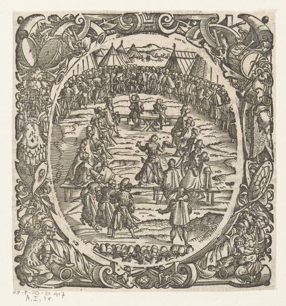 Editor: Here we have "Soldatenhoeren en kinderen," or "Soldiers' Whores and Children," a print made in 1573 by Jost Amman. The tight composition and antiquated engraving style create a starkness that feels simultaneously immediate and historical. What do you see in this piece, looking at it through the lens of an iconographer? Curator: Indeed, this image teems with cultural echoes. Beyond the explicit depiction of mercenary life, consider how Amman uses the procession motif. Throughout history, processions symbolize power, order, and community values. But here? It’s subverted, grotesque. Editor: How so? Curator: Observe the women: they are not the idealized Madonnas of religious processions, but instead the camp followers of a brutal army. The children, too, carry the weight of disrupted lineage, their innocence overshadowed. Amman employs the symbolic vocabulary of civic pride to highlight moral decay and social breakdown in the wake of endless war. The ornamentation even evokes pagan imagery, contrasting sharply with Christian virtues. What underlying tensions does this juxtaposition reveal? Editor: I guess it underscores the artist's critical perspective on war and its consequences. The image challenges any romanticized view of military campaigns, highlighting the corruption and displacement it causes. Curator: Precisely. Visual symbols act as a conduit, channeling a shared cultural memory and allowing Amman to speak volumes about the human cost of conflict. We find meaning through careful study of iconography that is at once intentional and unconscious in visual creation. Editor: That’s a sobering thought – and makes me look at it in an entirely new light. Curator: Art offers profound insights into historical memory, reminding us that images can embody not just individual expression, but shared experiences.