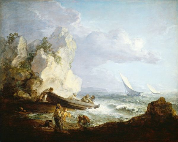 Bonaventura Peeters painted this imaginary inlet scene on a panel sometime in the first half of the 17th century. The muted palette of greys, browns, and blues establishes a tranquil, yet slightly ominous atmosphere, typical of the Dutch Golden Age maritime painting. Peeters masterfully organizes the composition around three distinct zones: the open sea with ships, the rugged coastline, and the foreground beach. Each zone is rendered with a different texture, creating a sense of depth and spatial complexity. The dramatic rock formations punctuating the center of the artwork draw the eye and establish a visual rhythm, contrasting with the smooth expanse of the sea. The figures on the beach, engaged in a bear hunt, introduce a narrative element, disrupting the calm with a scene of conflict. This interplay between serenity and violence challenges the viewer to question the nature of exploration and conquest. The flag on the ship further complicates this dynamic, hinting at territorial claims and the imposition of power. Consider how the interplay between light, texture, and form invites us to contemplate not only the beauty but also the underlying tensions inherent in humanity's relationship with the natural world.