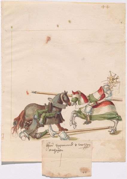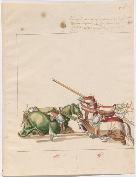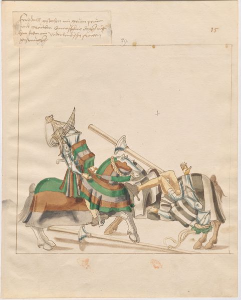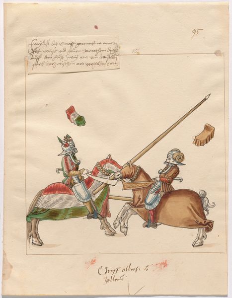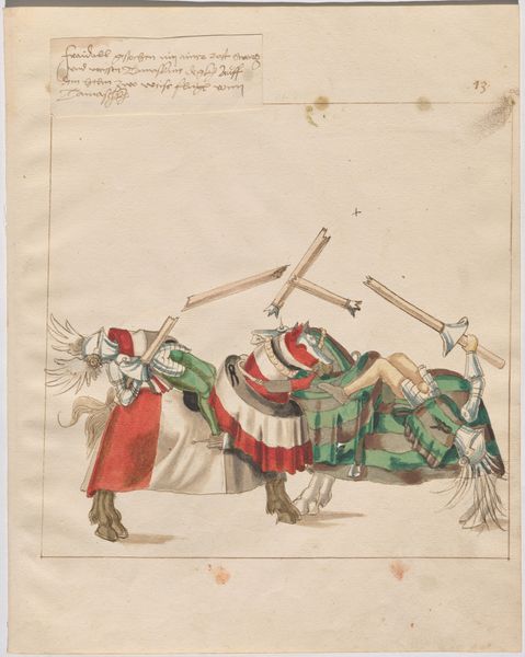 This small drawing, "German Joust of Peace in High Saddles," was made anonymously using ink and watercolor on paper. The material itself—paper—is key to understanding its purpose, and the role of the artist, who was likely more of a recorder or documentarian than a fine artist in the modern sense. The thinness of the medium allowed for great detail, capturing the jousters' armor, the horses' trappings, and even the expressions on their faces. This wasn't about conveying an individual artistic vision, so much as capturing the social theater of the event. The production of such drawings was closely linked to the rise of printing, a technology that democratized access to images, but required skilled draftspeople to translate real-world scenes into reproducible formats. So, while the drawing may appear to be a quaint historical artifact, it’s actually deeply connected to the rise of mass media and the changing landscape of labor and craft.