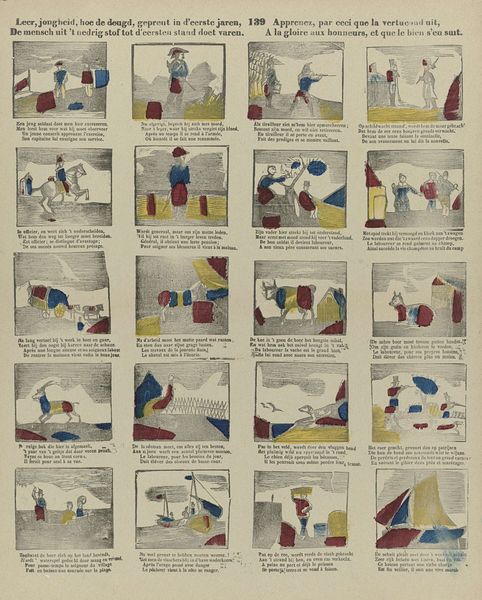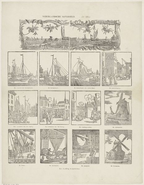 Editor: Here we have “Nederlandsche Nijverheid,” which translates to “Dutch Industry.” It's an etching, lithograph, and print made sometime between 1856 and 1900 by Glenisson & Zonen. It depicts different aspects of Dutch trade, from herring fishing to windmills. I am immediately drawn to the almost comic book-like grid structure. What formal qualities stand out to you in this piece? Curator: The composition is indeed quite striking. Note the way the artist has utilized a compartmentalized structure, almost like a series of vignettes, to depict various facets of Dutch industry. Consider how this organization impacts the overall reading of the artwork. Do you perceive a particular rhythm or hierarchy within these individual scenes? Editor: I do notice that the top two scenes seem larger and more decorative, and might frame the other smaller scenes beneath. But why use such muted colors? Curator: The color palette, although seemingly limited, plays a crucial role in creating a sense of unity across the diverse subject matter. The restricted hues force us to engage with the linear qualities of the etching. Notice how line and form, rather than color, define each scene, and also how this constraint serves to elevate the formal structure. Editor: I never thought about it that way, how limitation can highlight form! So, it’s about focusing on line and form over color for cohesion and a visual experience that emphasizes structure. Curator: Precisely. And how do these formal elements—line, composition, and the careful arrangement of forms—contribute to the artwork's message? What does it suggest about the depicted industries themselves? Editor: Well, the rigid structure might represent the organized nature of Dutch industry at the time. Thank you for pointing out the structural qualities, I was totally missing them before!