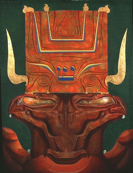Ernst Fuchs painted "Cherub En Face with Orange-Colored Horns of Flames", using oil on canvas. Fuchs lived through World War II and this likely influenced his later artworks. Looking at the artwork now, notice how Fuchs inverts traditional religious iconography; rather than a soft, docile cherub, we are presented with a metallic, foreboding figure, casting aside conventional notions of purity and innocence. The horns of flames add to the sense of unease, questioning the binary of good and evil. The cherub is presented "en face," directly confronting the viewer, disrupting the conventional passive role assigned to religious subjects, challenging power dynamics. Through his art, Fuchs invites us to consider the complexity of the human condition, and of religious belief, and our own relationship to it. Are we angels, demons, or something in between?