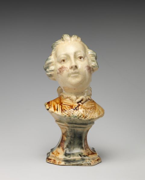 Curator: The Metropolitan Museum of Art houses this intriguing piece from the Chelsea Porcelain Manufactory, "Lady's Head," estimated to have been crafted between 1755 and 1765. Editor: Porcelain, right? The stark whiteness and delicate decoration give it such a palpable preciousness. It’s almost unnerving, like a fragile effigy. Curator: Precisely. It embodies the Rococo aesthetic. The slightly averted gaze, the blush on her cheeks, the small, pursed lips... It echoes ideals of feminine virtue and aristocratic aloofness. Editor: That blue ribbon detail also highlights that strange materiality. Notice how it's simultaneously sculpted and part of the surface – like an industrial product aspiring to be both functional and precious. It really speaks to the burgeoning consumer culture. Curator: Yes, the ribbons can act as restraints but also ornamentation. Those carefully placed decorations, the floral accents at the base, these motifs trigger centuries of inherited iconography linking women, beauty, and decorative objects. The head is almost separated from its adornment. Editor: Right, because consider the process here: multiple firings, skilled labor in the mould-making and glazing, a whole social infrastructure propping up this...head. The level of craft needed feels incredibly intensive compared to the product itself. Curator: This very particular process would only result in the material reproduction of beauty standards. As with other portraits, there is an effort to construct and then reflect back a defined, elite femininity of the period. Editor: Definitely. You know, analyzing the 'Lady’s Head' in terms of its social and material production exposes how even decorative objects reinforce these ideas and contribute to their lasting power. Curator: I concur. And the symbolism, while delicate, holds its own assertive influence. Thank you for your insights into this multifaceted artwork. Editor: My pleasure. I find that unraveling the art's components helps bring that influence into sharper focus for our listeners.