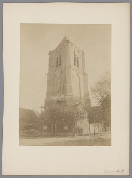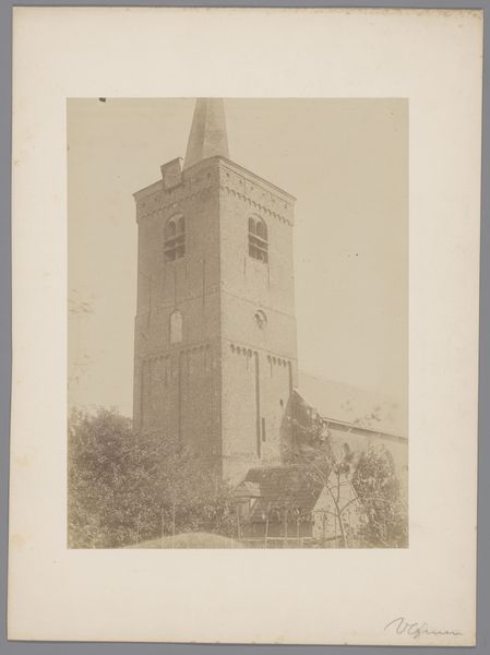Editor: This beautifully toned photograph, "Kerktoren te Ouwerkerk," capturing a church tower in 1897, is an unsigned piece held by Monumentenzorg. It has a delicate, almost dreamlike quality... kind of melancholic, would you agree? What feelings or ideas does it stir in you? Curator: Melancholic is spot on! The tones are so muted, it’s as if the image itself is fading, just like memories tend to do. Notice how the photographer positions us—not as if we are walking *towards* the church, ready for Sunday service but from this hazy periphery, obscured slightly by foliage and, even more cleverly, time. This makes it more than a simple architectural record, doesn’t it? Editor: It certainly does. There’s a strong sense of place and perhaps even longing... Did this area experience specific historical events at the time that might shed light on this? Curator: Perhaps, and that may require some digging. But let's ponder on the way it has been recorded. What resonates with me is the yearning quality this work embodies and inspires. It is the idea that we will always yearn to go back... to touch what is gone. Or even something we have only witnessed at a remove. And the photo helps us understand this, which feels nothing short of miraculous. It makes one feel closer to that specific instant, long gone. It is that ghostly resonance with other times that stays with me. Editor: I love the idea of a ghostly resonance! It adds such depth to what initially appeared to be a simple photograph. I am starting to consider photography as a unique means to remember. Curator: Exactly. Art allows us to see and *feel* more clearly. The dust, the stillness, the yearning gaze and faded instant... these things invite reflection far beyond historical facts. Editor: Definitely given me a lot to consider! Thanks for your insight.