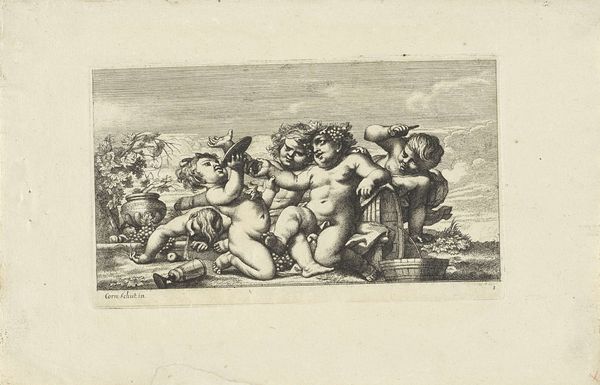 This etching, "Putti met bloemen", was created by Paul van Somer the Younger in the late 17th century. Here, we observe a group of putti—those chubby, winged infants so beloved in Renaissance and Baroque art—frolicking with flowers, symbols of love and ephemeral beauty. Note how the putto is reminiscent of the ancient Roman Cupid, or the Greek Eros. These figures go back to the Hellenistic period, often appearing in art as allegories of desire and affection. Yet, here they are transformed into innocent, playful beings, adorning scenes of earthly delight, their form evolving through cultural adaptations. The gesture of offering and receiving flowers evokes deep-seated emotional responses, touching on our collective memories associated with love, celebration, and the fleeting nature of life. The image stirs something primal within us, a connection to joy and innocence, engaging us on a level that transcends mere visual appreciation. The recurring motif of the putto is not just a visual echo, but a reminder of how these images have been imbued with meaning across centuries, resurfacing and evolving, reflecting our ever-changing understanding of love, beauty, and the human spirit.