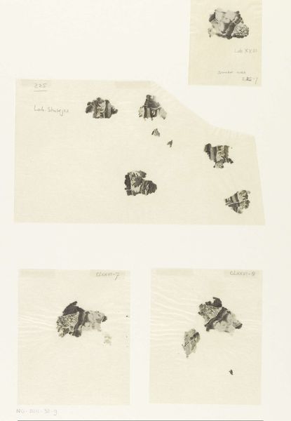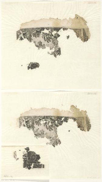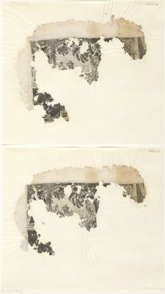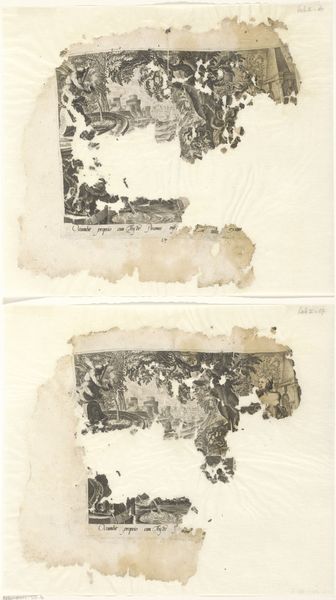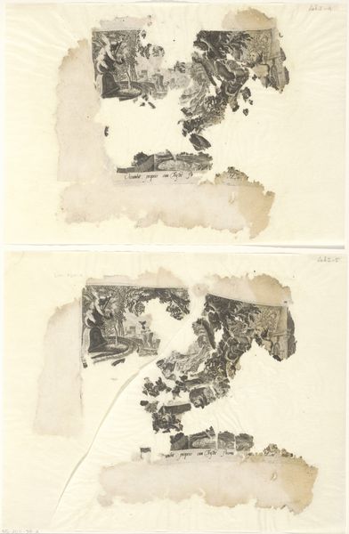 Here are fragments of a print depicting Pyramus and Thisbe, made by an anonymous artist, using a printing process, on paper. Consider the material fragility of these paper fragments. The stark contrast between the delicate, thin paper and the bold, dark ink creates a visual tension, emphasizing both the vulnerability of the medium and the power of the printed image. The process of printmaking, with its reliance on repeatable gestures, speaks to a wider social context of reproduction, labor, and consumption. Each impression would have been produced through careful application of pressure, a repetitive task that reflects the labor involved in creating multiples. The fragmented state further adds another layer, inviting contemplation on the nature of time, loss, and the transient nature of human endeavors. What was once a complete image, a story, is now reduced to remnants. Looking at these scraps, we are reminded that the value of a work of art lies not only in its final form, but also in the materials, the making, and the social context that inform its creation.
