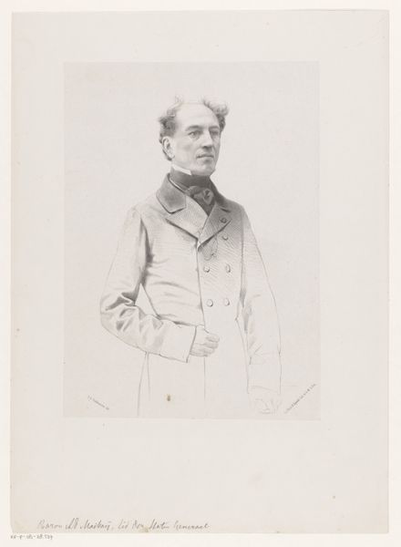 This is Johan Hendrik Hoffmeister's "Portret van Jacob Pieter Pompejus van Zuylen van Nijevelt", made with graphite on paper. The portrait is strikingly composed with a sophisticated interplay of light and shadow that models the subject’s face and clothing, creating a palpable sense of depth. The artist’s precise linework and attention to detail invite us to look closely. Note how the use of tonal variation enlivens the figure against a muted backdrop. The choice of graphite, and the careful application of lines, provides insight into the subject's personality and social standing. The texture of the paper support is evident, and the artist masterfully employs the tools of the draughtsman's trade. This invites an interpretation of the subject through the structural elements and inherent qualities of the artistic medium. Ultimately, Hoffmeister's formal manipulation of graphite brings the subject to life, revealing the power of drawing as a potent means of representation and expression.