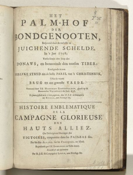 This is the title page for "Vorstelyke Staat-Balans," or "Princely State Balance," made around 1709-1710 by Abraham Allard. The structure is defined by a hierarchy of fonts and languages. The Dutch titles, proclaiming "War and Peace in Europe," alternate with their French counterparts, such as "La Guerre et la Paix d’Europe". The layout reveals a formal approach to disseminating political messages during a time of conflict. The typography uses size and bolding, which gives the page a sense of order. Yet, the page hints at more. The idea of a "balance" and the mention of false weights introduces a semiotic system. Here, the text uses cultural codes to critique political manipulations. The strategic deployment of language and typography serves not just to inform, but to persuade. The overall layout isn’t just decorative, but actively creates a discourse. It invites us to consider how texts, like images, are constructed to reflect and influence cultural understanding.
