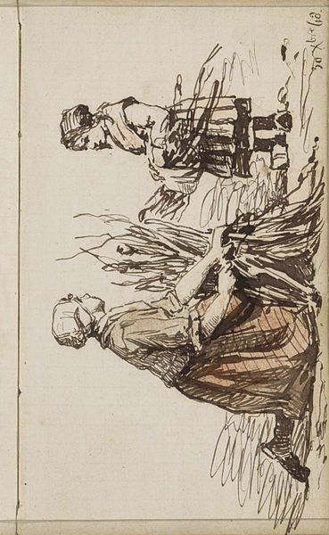 Curator: Let’s turn our attention to a work by Johannes Tavenraat, titled "Twee boerenvrouwen bij de stam van een lindeboom," which roughly translates to "Two peasant women at the trunk of a linden tree." It dates to somewhere between 1839 and 1872. Editor: The piece has a poignant, almost dreamlike quality. It feels incredibly ephemeral. The lines are so light and suggestive. Curator: Indeed, Tavenraat has captured the figures with a remarkable economy of line, hasn’t he? Note how he suggests form and volume through the subtle variations in the pencil work, particularly in rendering the folds of their garments. Editor: I’m particularly drawn to the placement of the women. The woman higher on the page is stepping off what may be the banks of a low stream, a brook used for washing and the spreading of linen by women. The work invokes not just genre-painting themes, but hints at labor, community, and even collective bargaining when one takes into account the number of strikes in the region. Curator: That's a very insightful observation. Focusing on the compositional elements, the verticality of the linden tree trunk creates a strong axis, against which the women are arranged in almost a mirror image. Editor: Mirrors aren't innocent things either, though, and the act of seeing oneselves isn't ever completely neutral. How did this image serve to other these women? And, importantly, did they ever get to look at themselves in mirrors or did the labor always make them into something they were told they were and never allowed to consider how they looked for themselves? Curator: Those considerations do highlight a different layer of interpretation to consider here. Returning to the form, I also find it fascinating how the negative space around the figures contributes to a sense of airy lightness. This technique draws focus back to the two peasant women under consideration. Editor: For me, it underlines their isolation, their liminality within the broader social structure. Though positioned close, it seems that a reflection is also a lonely condition. Curator: Thank you. Your reflections truly enriched my understanding of Tavenraat’s work. Editor: It was a pleasure. Let's be sure to consider whose perspectives aren't available on this image.