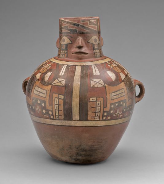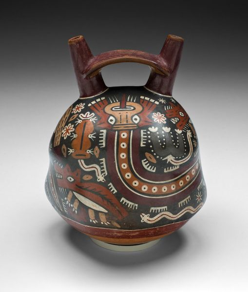This bottle, made by the Tiwanaku people, features a masked figure and abstract feline and textile motifs. Likely created in the Andean region of South America, it offers a window into a society where religious and political power were intertwined. The bottle’s imagery, rich in symbolism, speaks to the beliefs and social structures of the time. The masked figure at the top might represent a deity or a high-ranking priest, reflecting the hierarchical nature of Tiwanaku society. The abstract feline motifs were likely related to power and protection. The textile patterns, rendered onto ceramic, may allude to the central importance of textile production within the Tiwanaku economy. Historians studying such artifacts consult archaeological records, ethnographies, and studies of trade routes to understand the bottle's original function and meaning, but also the precise nature of the institutional and political power it represented.