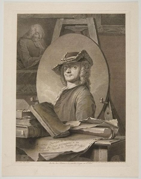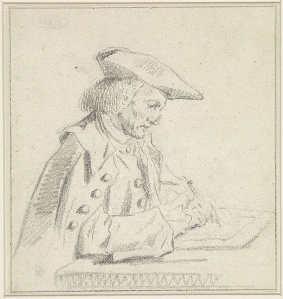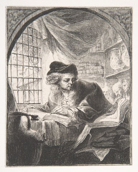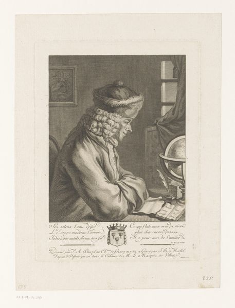 Editor: So, this is John Greenwood’s print, “Portret van Jurriaan Buttner,” dating back to somewhere between 1737 and 1792. It's an engraving, and it strikes me as intensely focused. All the lines draw my eye to Buttner and his concentrated gaze. What do you see in this piece? Curator: Well, first off, you’ve gotta love the immediacy, right? I feel like I'm intruding on a very private moment. The guy’s so engrossed, it's almost voyeuristic. And the cross-hatching, the sheer detail he’s packed into a tiny print. It's Baroque drama meeting Realism's sharp gaze. Does his commitment spark a hunger for close looking within you too? Editor: Absolutely! It makes me want to grab a sketchbook myself. So, the inscription beneath the image… is it related to the portrait? Curator: Intriguing, isn’t it? My loose translation tells me that Fine art isn't exclusively for the young... someone becomes a master by training into their elder years. Its inclusion tells me that Buttner maybe had the gift of age, and years of practice; I admire his talent for being devoted. Editor: I love that! It adds another layer to the narrative. At first glance, it's just a portrait. But it celebrates the dedication to craft that comes with time and experience. Curator: Exactly! Art about art, practice, dedication. The whole image is full of the life-affirming value of practice; to stop learning is to stop living! And doesn't that make this much more powerful? Editor: It really does. It transforms my understanding of this artwork completely.