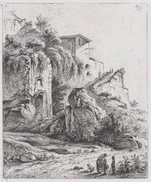 Curator: Oh, there’s something haunting about this one. Like a half-remembered dream… It feels lonely but beautiful. Editor: This is "Waterfall after Breenberg," an etching by Jean-Jacques de Boissieu, created in 1764. It’s a stunning example of the Neoclassical movement's fascination with idealized landscapes. Curator: Ah, "idealized" is the right word. It's almost too perfect, isn’t it? The controlled lines, the almost architectural precision of that waterfall… It's romantic, but with a touch of constraint. Editor: Absolutely. It's an imagined landscape informed by existing etchings, Breenberg. De Boissieu, known for his detailed work, reinterprets earlier themes through a particularly ordered lens. The very act of taking a raw, natural form like a waterfall and rendering it with such controlled etching underscores the period's impulse to classify and control nature through art. Curator: Yes, and the figures perched at the top... distant observers, further emphasizing that separation between humanity and nature. But also between class and place, no? I find it slightly unsettling, as if nature is meant to be passively observed. Editor: That's a very keen observation. And one can't forget that these kinds of images were often consumed by elite audiences. Prints like this democratized access to visual art to a degree, while still very much circulating within privileged circles, reinforcing certain viewpoints and aesthetic ideals. Curator: It feels that in those days, art was much more than what was represented on a canvas—it had to reflect how life should be led according to certain social values. The technique in it is masterful, no question. But the coldness of this controlled wild feels artificial. I guess this landscape is an imagined place of the privileged. Editor: The image indeed mirrors those cultural expectations of the period. Well, it certainly gives a lot to ponder, doesn’t it? Curator: It really does! I see and feel something different each time I look at it.
