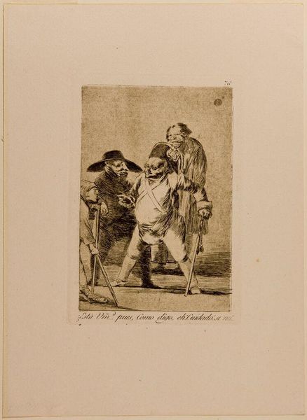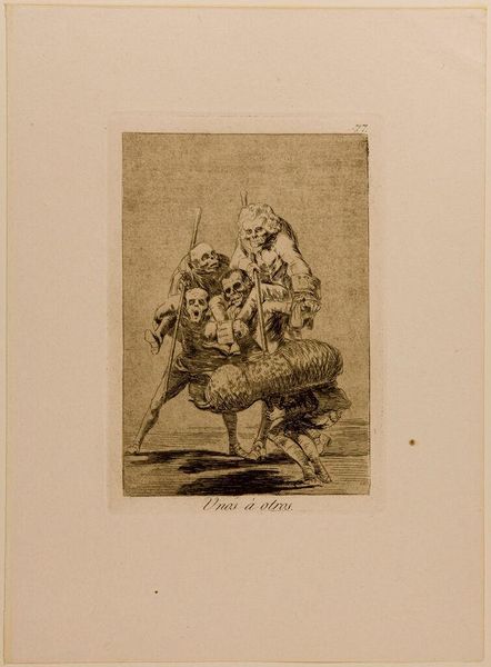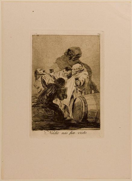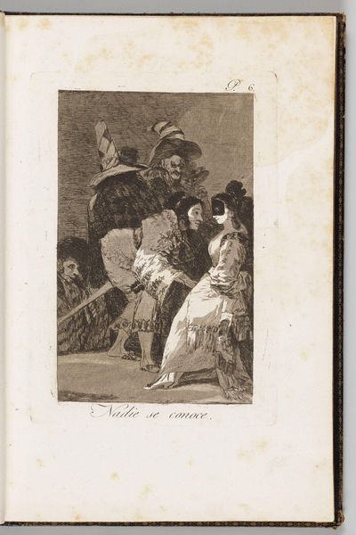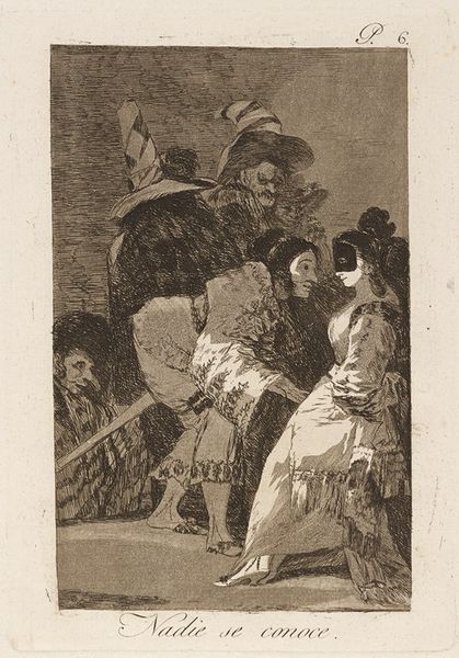 Curator: This print, "No One Knows Himself," is by Francisco José de Goya y Lucientes, part of a larger series and currently residing at the Harvard Art Museums. Editor: The scene has a slightly unsettling feeling, doesn’t it? The etching is dark, and the figures feel a little menacing. Curator: Goya often used his art as social commentary, and this print is no exception. The masks worn by many of the figures suggest a critique of societal roles. These masks signify the hidden identities within social structures, revealing concealed intentions. Editor: That’s a fascinating point. The title itself, "No One Knows Himself," suggests a deeper level of self-deception and perhaps a criticism of the aristocratic class and its perceived hypocrisy. Curator: Exactly. Goya uses satire to confront issues of identity and moral ambiguity within a historical context shaped by political unrest. The act of concealing becomes a metaphor for the lack of genuine self-awareness. Editor: It certainly gives you a lot to think about, doesn’t it? A critical reflection on the performances of self and the masquerades of social standing. Curator: It's a powerful, layered work that invites ongoing examination.