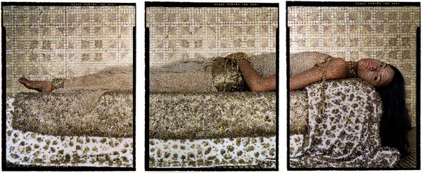 Curator: Lalla Essaydi's "Bullet Revisited #31 Diptych," created in 2013, is a mixed-media piece that incorporates both photography and painting. The piece makes direct reference to the orientalist genre. Editor: Whoa. My first thought is opulence, almost suffocatingly so. Gold everywhere! And then this contrasting feeling of stillness, even… sadness? It feels incredibly staged but very powerful. Curator: Essaydi often explores themes of identity, gender, and representation within the context of Islamic culture. She directly confronts and subverts orientalist tropes that historically objectified and misrepresented women from the Middle East and North Africa. It’s all a stage, you see? But it is one where women are taking ownership of that stage. Editor: It's interesting you say "ownership". This gold… is it beautiful? Is it gaudy? It feels both precious and imprisoning, and then, you have this veiled figure lying so listlessly among these elaborate textiles in each panel. I feel like she has completely disappeared into this setting… but that cannot be entirely right, can it? Curator: That is certainly part of the conversation here. The bullets – she has mentioned it refers to repurposing empty bullet casings, right? The image confronts viewers with questions about beauty, violence, and cultural constraints imposed on women, as well as the roles women assume, sometimes by force. In some ways, the gold makes literal the fetishization inherent to orientalist fantasy. Editor: The "revisited" aspect of the title is interesting too. As if this image is referencing a photograph or portrait in some way. Curator: Yes. Her work always initiates a dialogue between art history and contemporary theory. The "Revisited" titles address how images persist, haunt, are reshaped in culture. It also places this photograph in conversation with other photographs taken by the artist using very similar staging, textiles, and materials. She wants to explore how the intersectional identities shape subjectivity and agency. Editor: It definitely complicates what I initially perceived as “sadness." Now, I see it as more of a controlled sorrow. Curator: I'd say so, yes. Essaydi's skillful combination of photography and painting—the textures, patterns, and the sheer scale—invite viewers to actively engage with questions regarding cultural representation. Editor: Well, it has certainly disrupted my initial impression. Thank you!