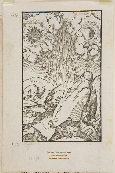 Editor: So, this is Hans Holbein the Younger's "The Vision of the Fifth Angel," a woodcut print. It's quite striking... a bit chaotic. What symbols stand out to you in this depiction? Curator: The well teems with crowned demons and serpentine figures, a visual motif for pestilence and moral corruption rising to the surface. Note the angel above, blowing the horn; do you think it heralds salvation or doom? Editor: Perhaps both, depending on the viewer's perspective? It's fascinating how Holbein uses familiar religious symbols to evoke such a strong emotional response. Curator: Indeed, and how these symbols echo through history, reflecting our enduring anxieties and hopes. A powerful visual legacy, wouldn't you agree?